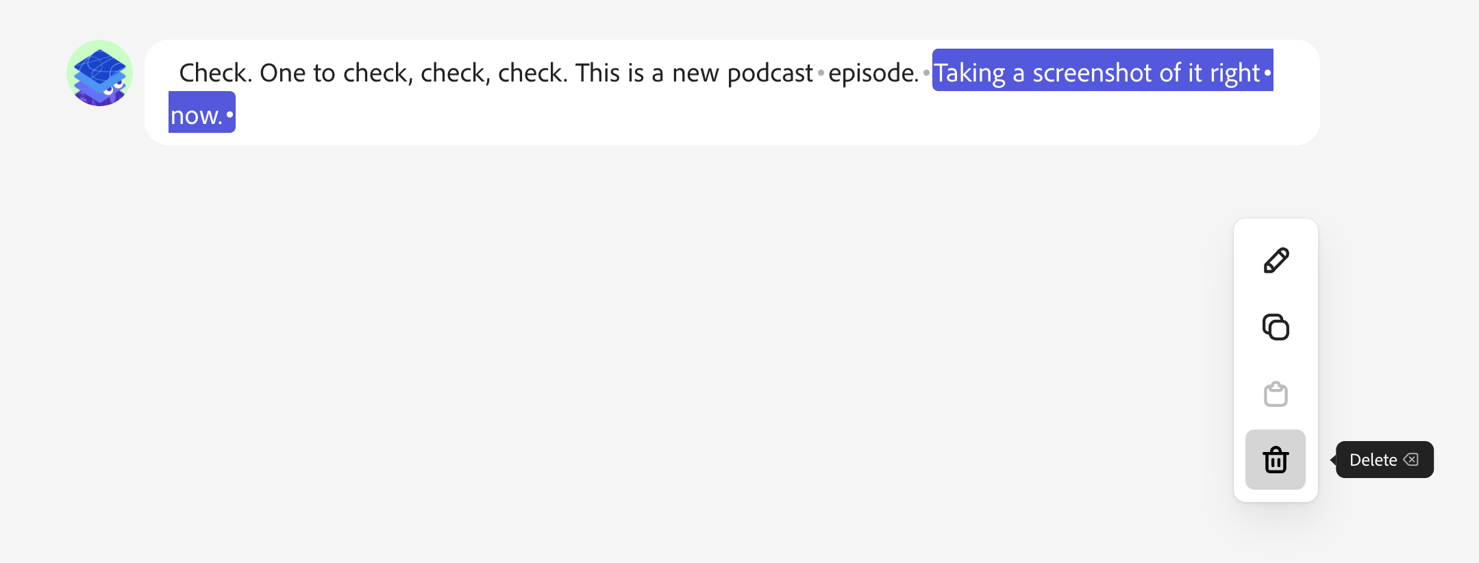 Highlight text in your transcript to edit the transcript. Press the delete button to delete the highlighted section (and it's corresponding audio) from your project.
